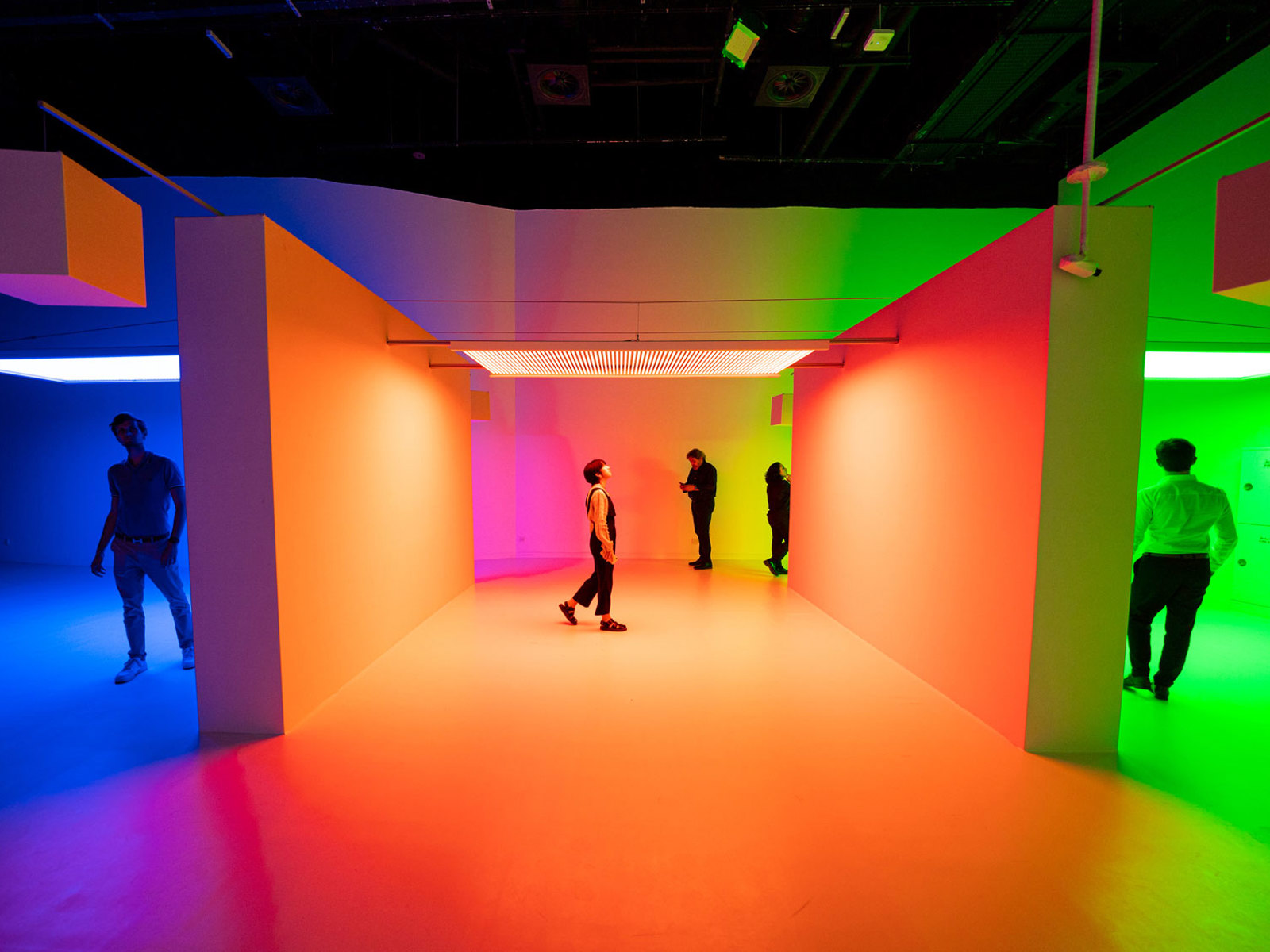 Dans l'espace d'exposition temporaire, les spectateurs actifs seront plongés dans une Chromosaturation, un environnement artificiel où trois sources lumineuses hyper-saturées de rouge, vert et bleu situées dans trois chambres distinctes fusionnent leurs teintes dans un espace ouvert, restituant ainsi l'ensemble du spectre et offrant à nos corps sensibles et à nos yeux incrédules un voyage à l'intérieur d'un arc-en-ciel.